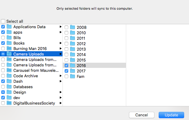 Next, you can enable this useful feature called selective sync through your Dropbox preferences to choose which folders you want to sync.