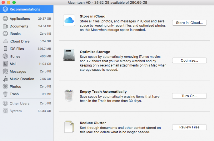 On Mac when you go to "About This Mac" > Storage > Manage... You can see recommendations to Optimize your Storage and Save Space.